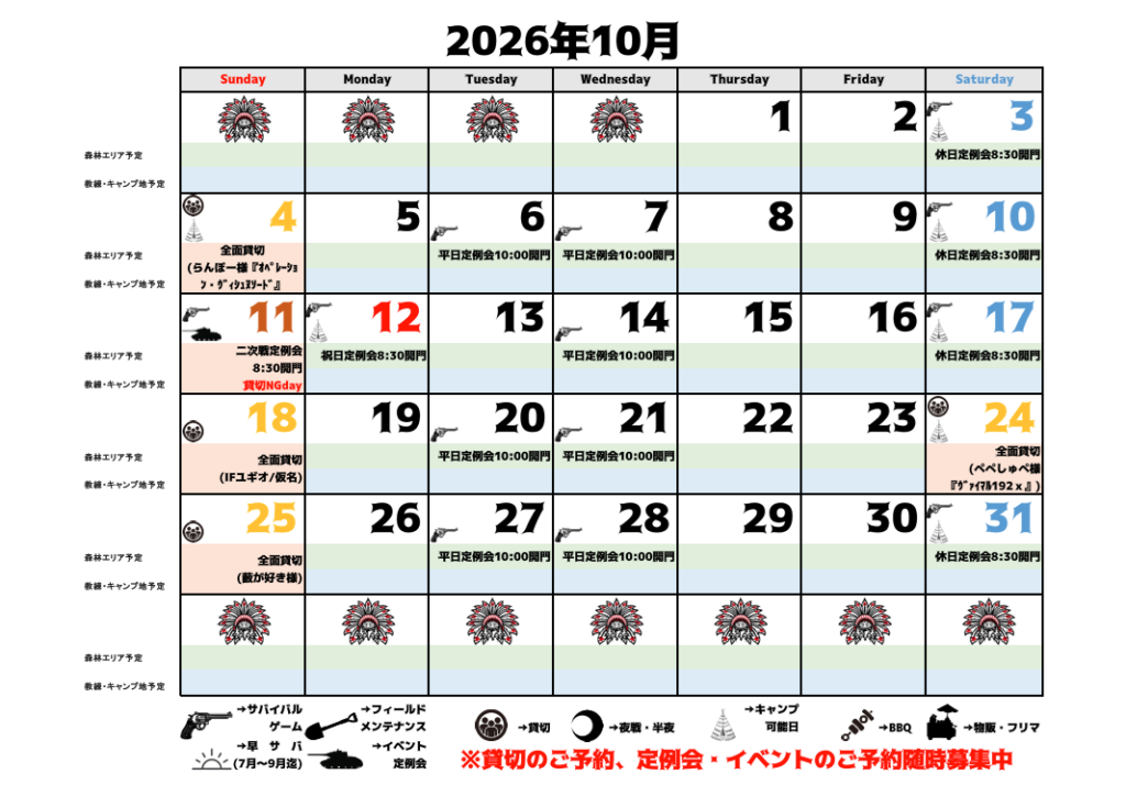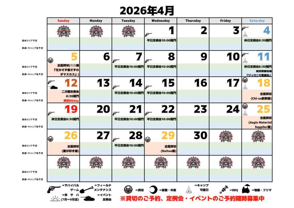 2026年3月から2026年12月までの予定表の情報と表示形式を更新致しました。貸切やイベントが入りましたら予定が追加される場合も御座います。貸切・イベント時以外は定例会の日も貸切可能となります。貸切予約は原則、日曜は1週間前まで・それ以外は3日前19:00までとなります。料金の詳細は料金をご覧下さい。