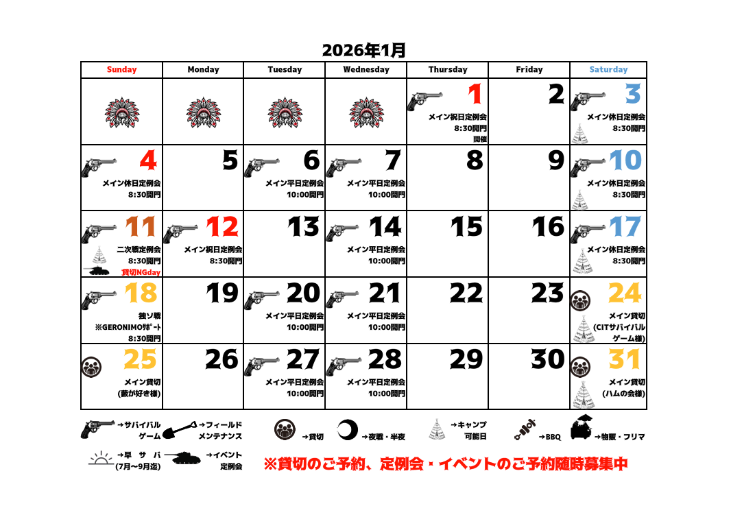 2026年1月から2026年12月までの予定表の情報を更新致しました。