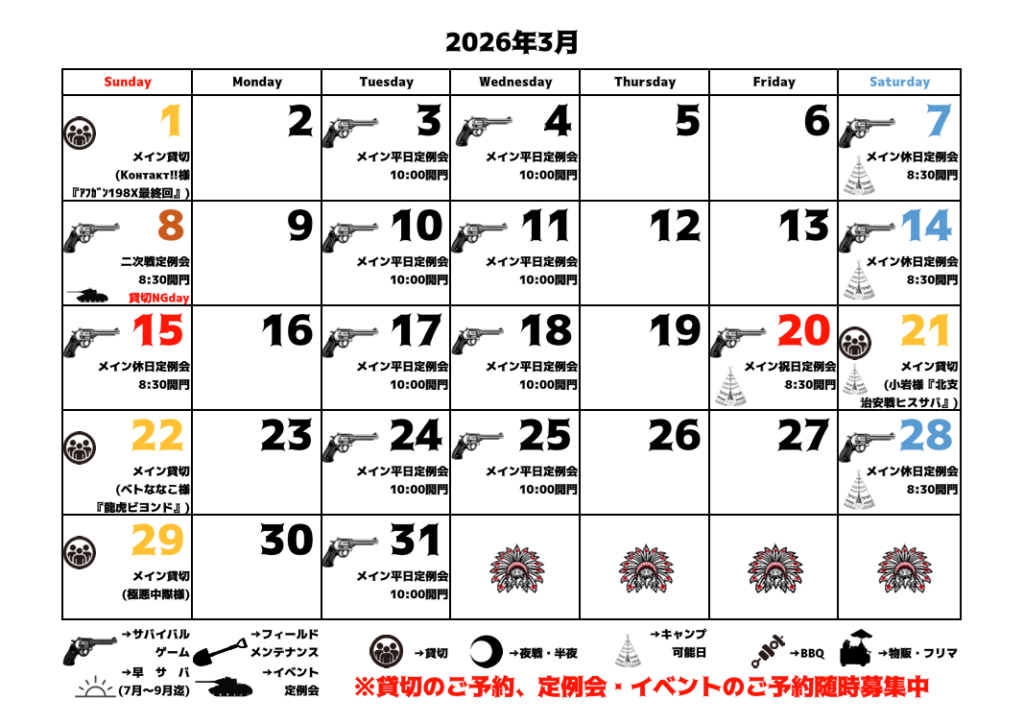 2026年1月・2月・3月の予定表を追加しました。貸切やイベントが入りましたら予定が追加される場合も御座います。貸切・イベント時以外は定例会の日も貸切可能となります。貸切予約は原則、日曜は1週間前まで・それ以外は3日前19:00までとなります。料金の詳細は料金をご覧下さい。