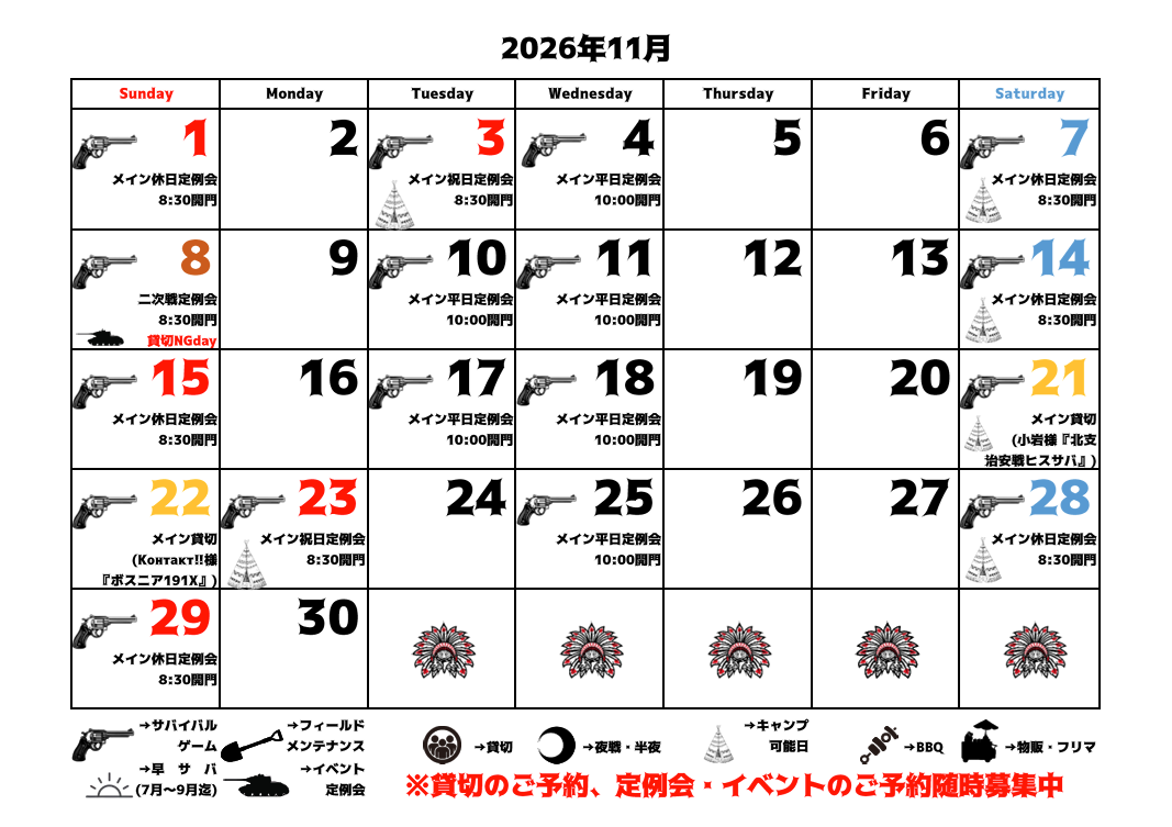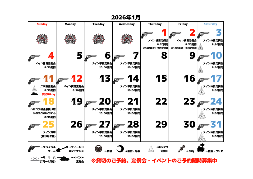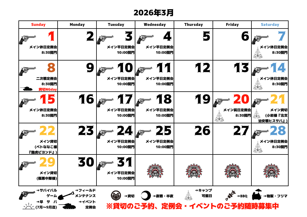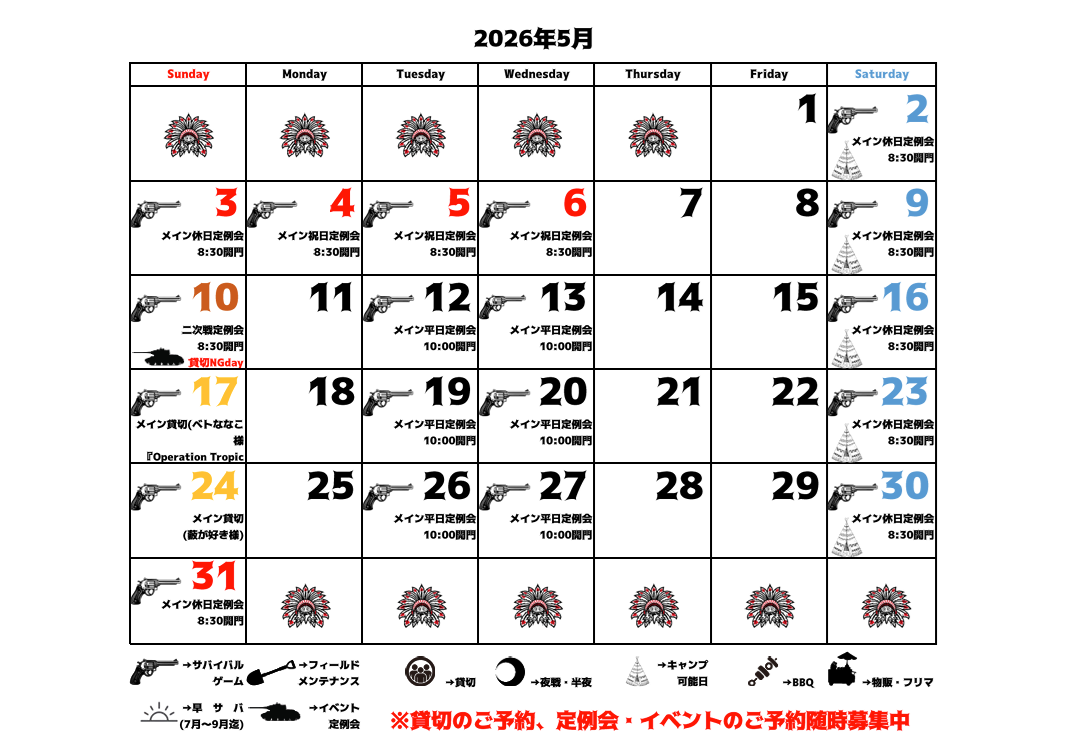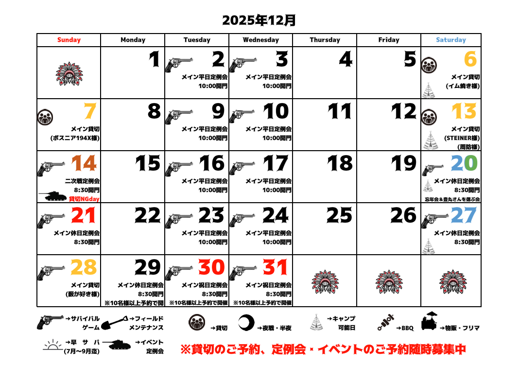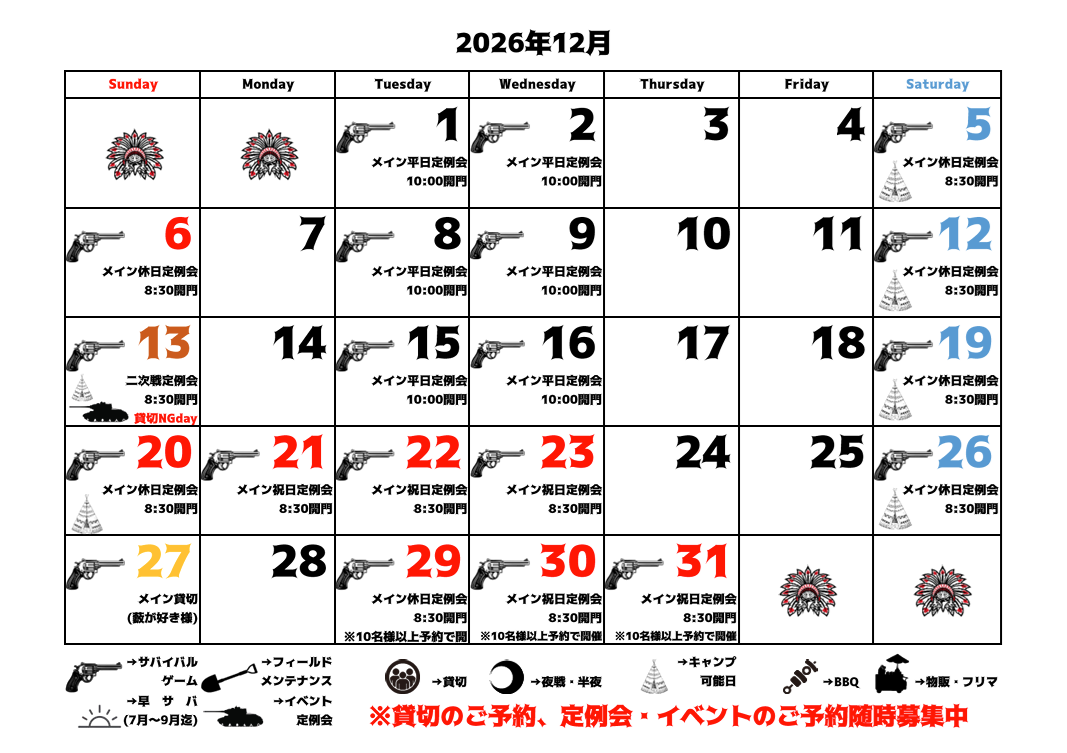 カレンダーの空白箇所・通常の定例会が入っている箇所に貸切を入れる事が可能となります。